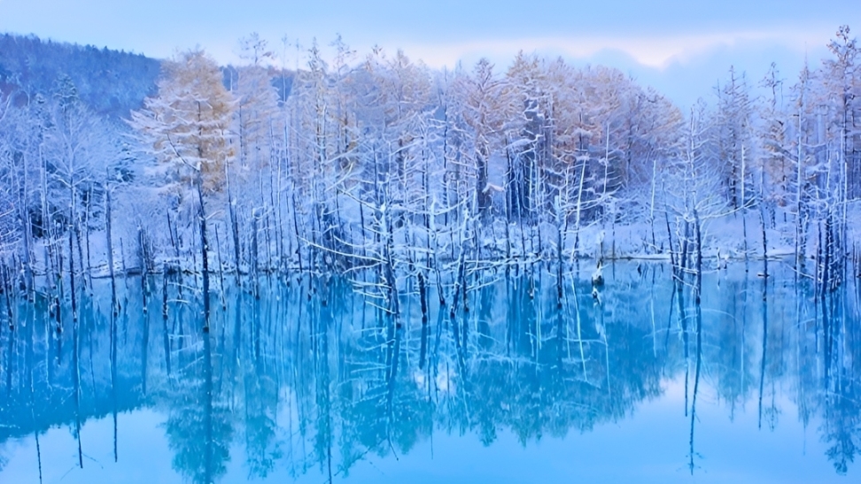 Hồ Xanh Shirogane tại thị trấn Biei là một trong những điểm đến huyền ảo nhất Nhật Bản vào mùa đông. Dù là một hồ nước nhân tạo được hình thành từ đập ngăn bùn núi lửa nhưng nơi đây đã trở nên nổi tiếng toàn cầu sau khi xuất hiện làm hình nền cho máy tính Apple với vẻ đẹp như tranh vẽ.