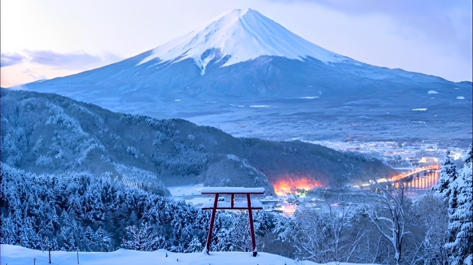 Dù Núi Phú Sĩ luôn mang vẻ đẹp biểu tượng quanh năm, nhưng tháng 12 lại khoác lên ngọn núi này một tấm áo choàng tuyết trắng tinh khôi, càng làm tăng thêm sức hút khó cưỡng. Cảnh sắc núi non và vạn vật xung quanh phủ đầy tuyết trắng, tạo nên một bức tranh mùa đông đầy mê hoặc.